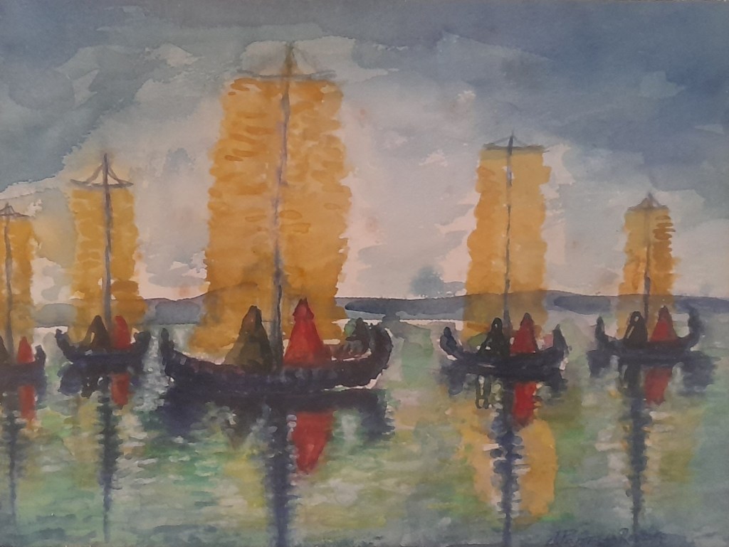El mismo pincel y tres maneras de expresar la esforzada y bucólica vida de los balseros del Lago Titicaca. Acuarelas. Colección privada.