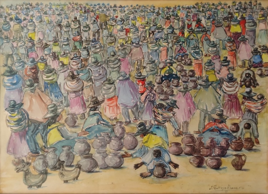 En esta escena multitudinaria cada figura, vestida con mantas de tonos andinos y sombreros regionales, forma parte de una sinfonía colectiva de intercambio, vida y tradición. Las cerámicas repetidas, variadas, casi vivas se convierten en símbolos del trabajo humano y de la memoria comunitaria