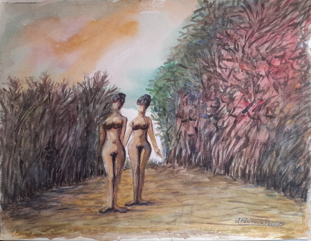Esta acuarela evoca un momento íntimo: dos figuras femeninas caminan, desnudas, por un sendero flanqueado por vegetación densa que parece observarlas, envolverlas, o incluso formar parte de ellas. En esta composición, Pantoja fusiona cuerpo y naturaleza, generando un espacio donde lo humano y lo vegetal se funden en un mismo plano simbólico..