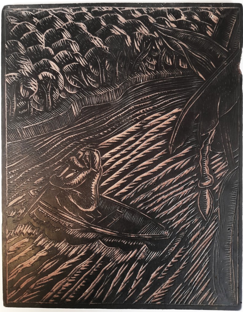 Con trazos decididos y composiciones de alto contraste, sus grabados capturan escenas de la sierra y la selva peruana: rostros hieráticos que se funden con la naturaleza, cuerpos que cruzan ríos ancestrales, y figuras femeninas envueltas en la frondosidad del bosque. La técnica es rigurosa, pero el mensaje es espiritual y telúrico.